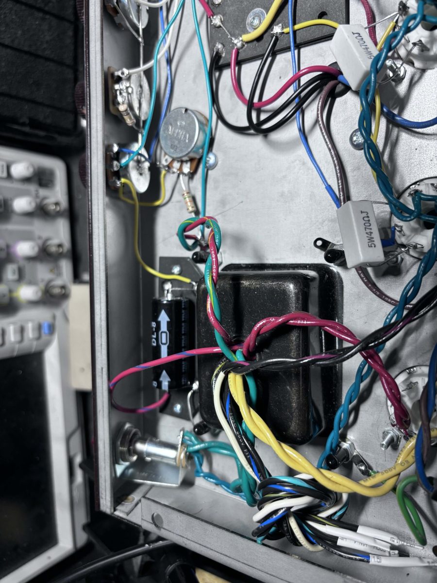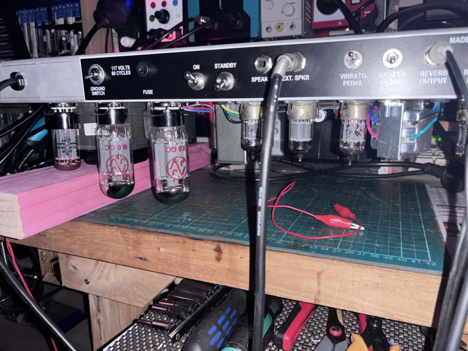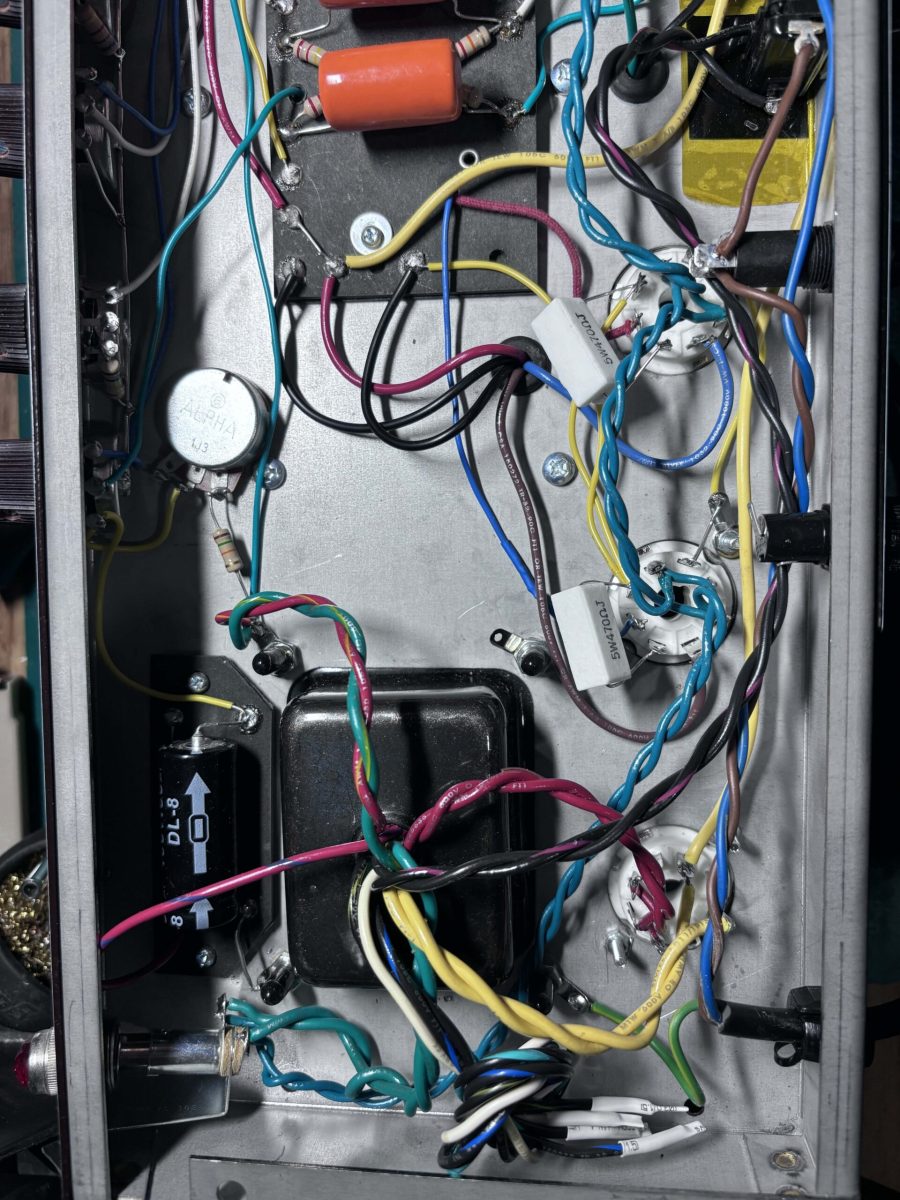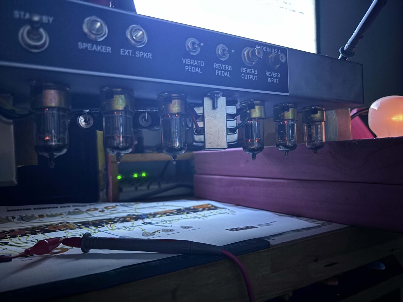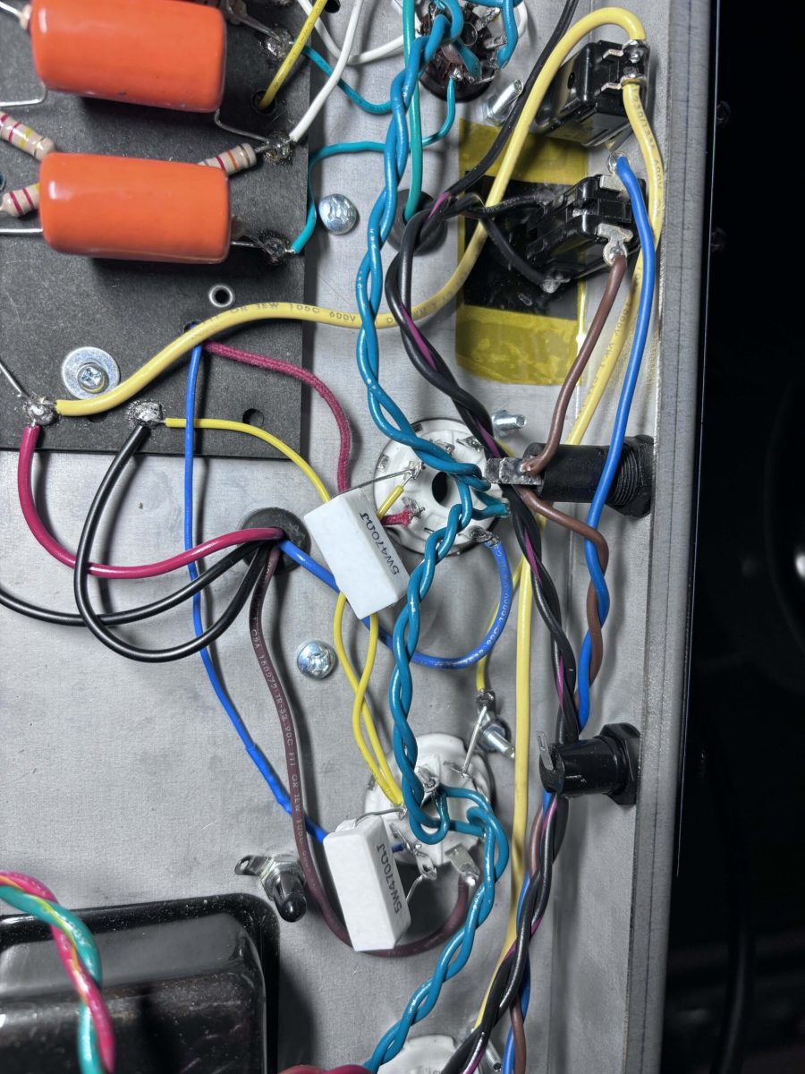 I had a fair few issues powering it up for the first time. I was using new old stock tubes and trying to get a matched set of power tubes was not easy. I did use a variac to bring the voltage up slowly so as to not damage the transformers which were the least replaceable part of the whole thing. I was chasing a hum for a while, which ended up being some wiring mistakes, bad jacks/switches and old caps which I swapped out in the end. Most of the passive parts aren’t ‘Period correct’ and neither is the wiring, but I used what I had around to finish the project out and get it working. I had to make a grounding jack for the vibrato as I wasn’t going to use it, and I was chasing a reverb not working issue for a while as well which was a wiring mistake + bad tubes.