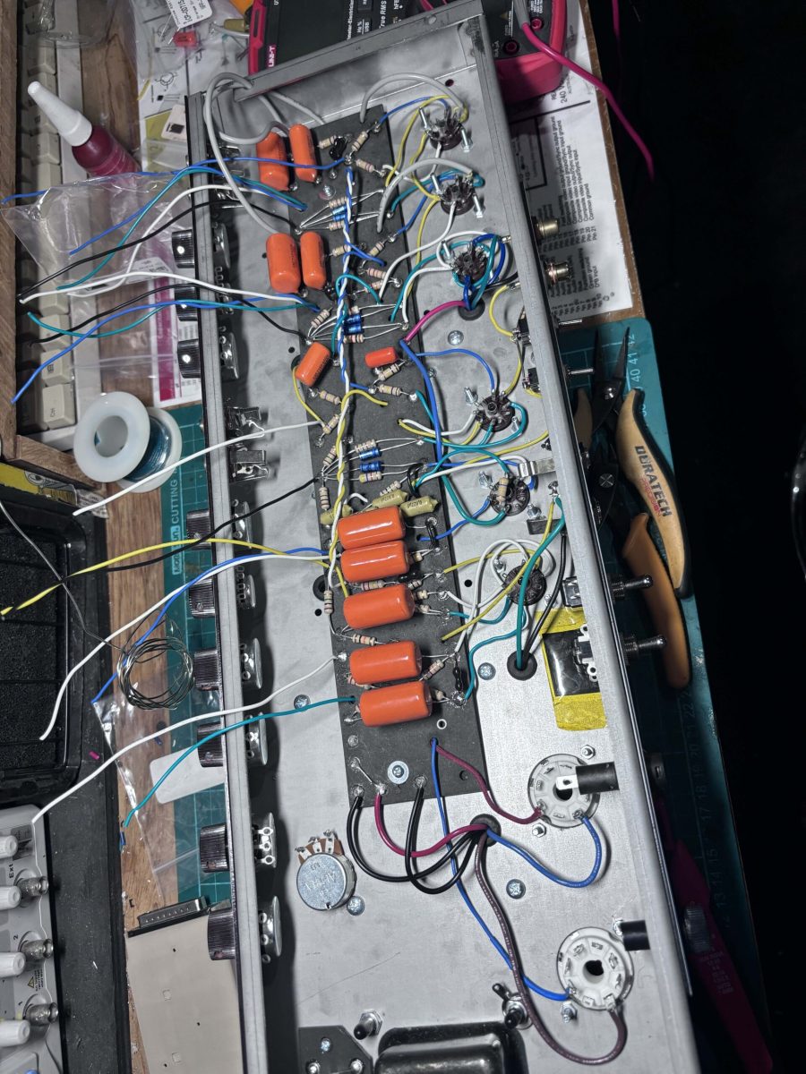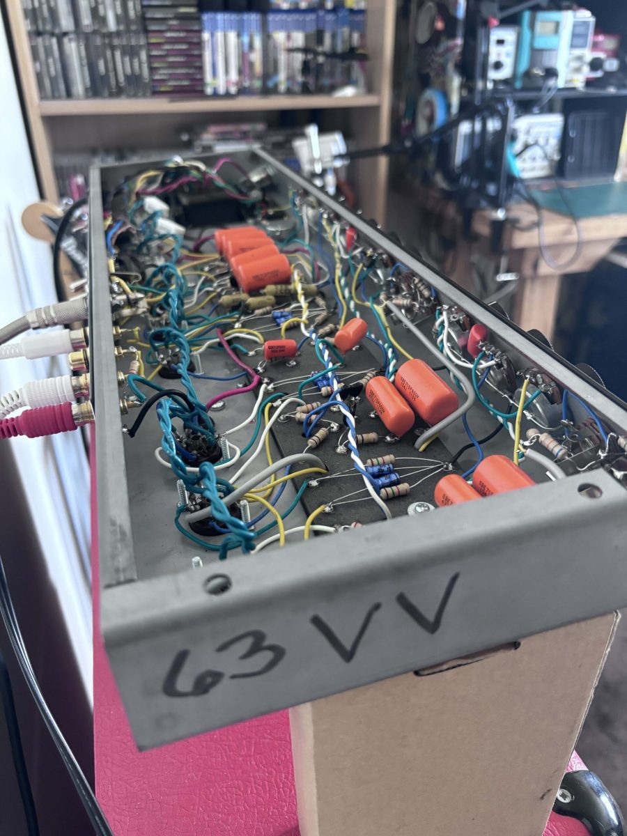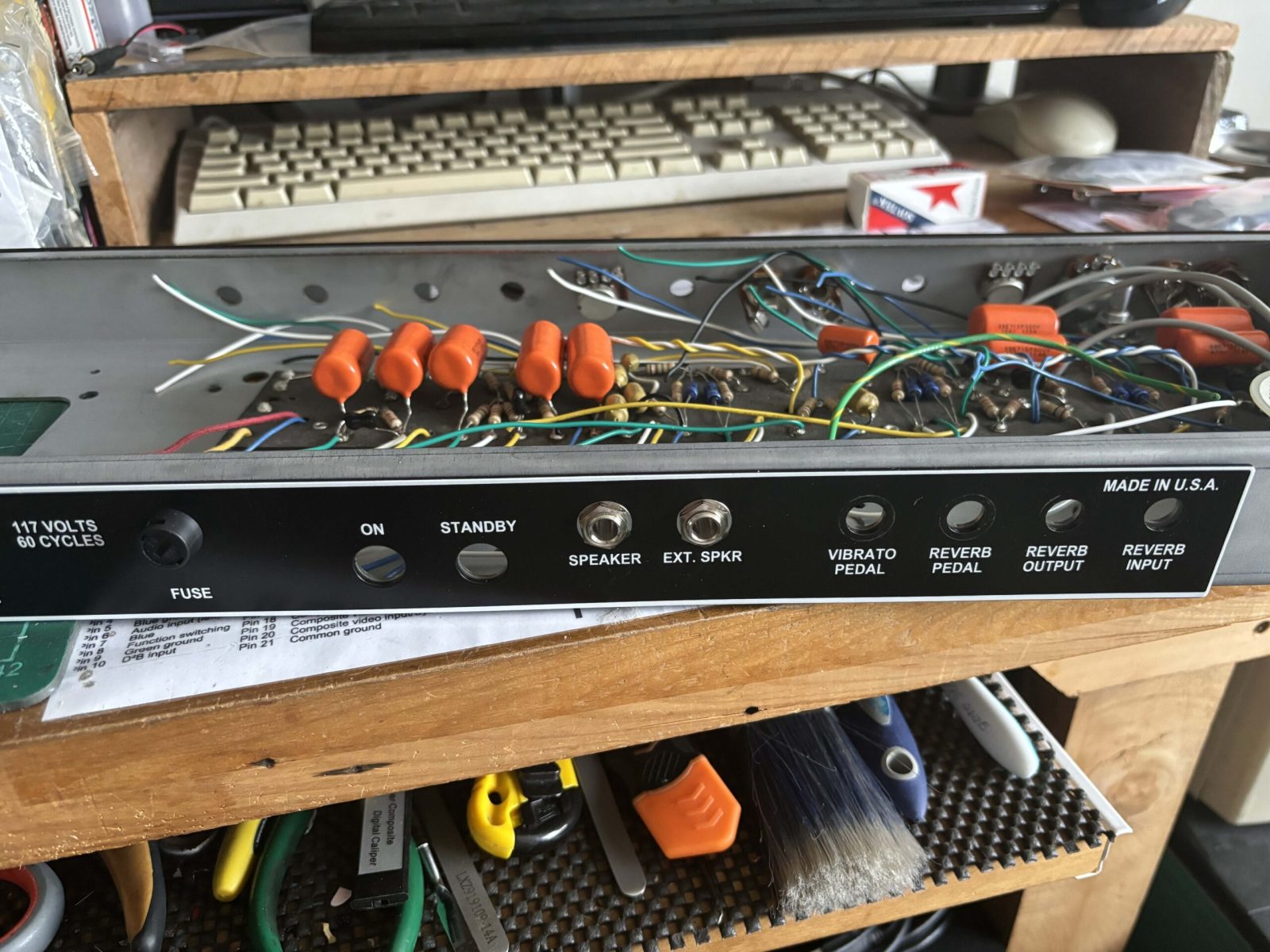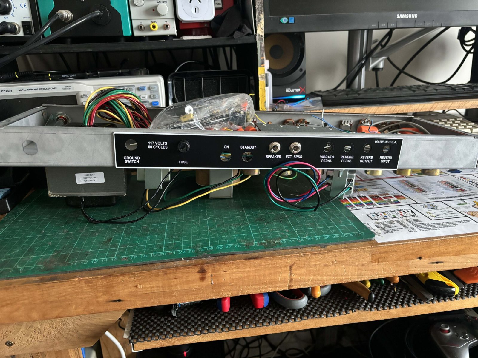 I had a fair few issues powering it up for the first time. I was using new old stock tubes and trying to get a matched set of power tubes was not easy. I did use a variac to bring the voltage up slowly so as to not damage the transformers which were the least replaceable part of the whole thing. I was chasing a hum for a while, which ended up being some wiring mistakes, bad jacks/switches and old caps which I swapped out in the end. Most of the passive parts aren’t ‘Period correct’ and neither is the wiring, but I used what I had around to finish the project out and get it working. I had to make a grounding jack for the vibrato as I wasn’t going to use it, and I was chasing a reverb not working issue for a while as well which was a wiring mistake + bad tubes.
