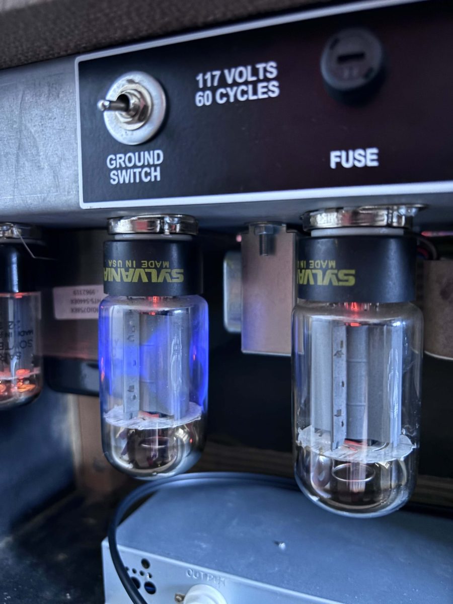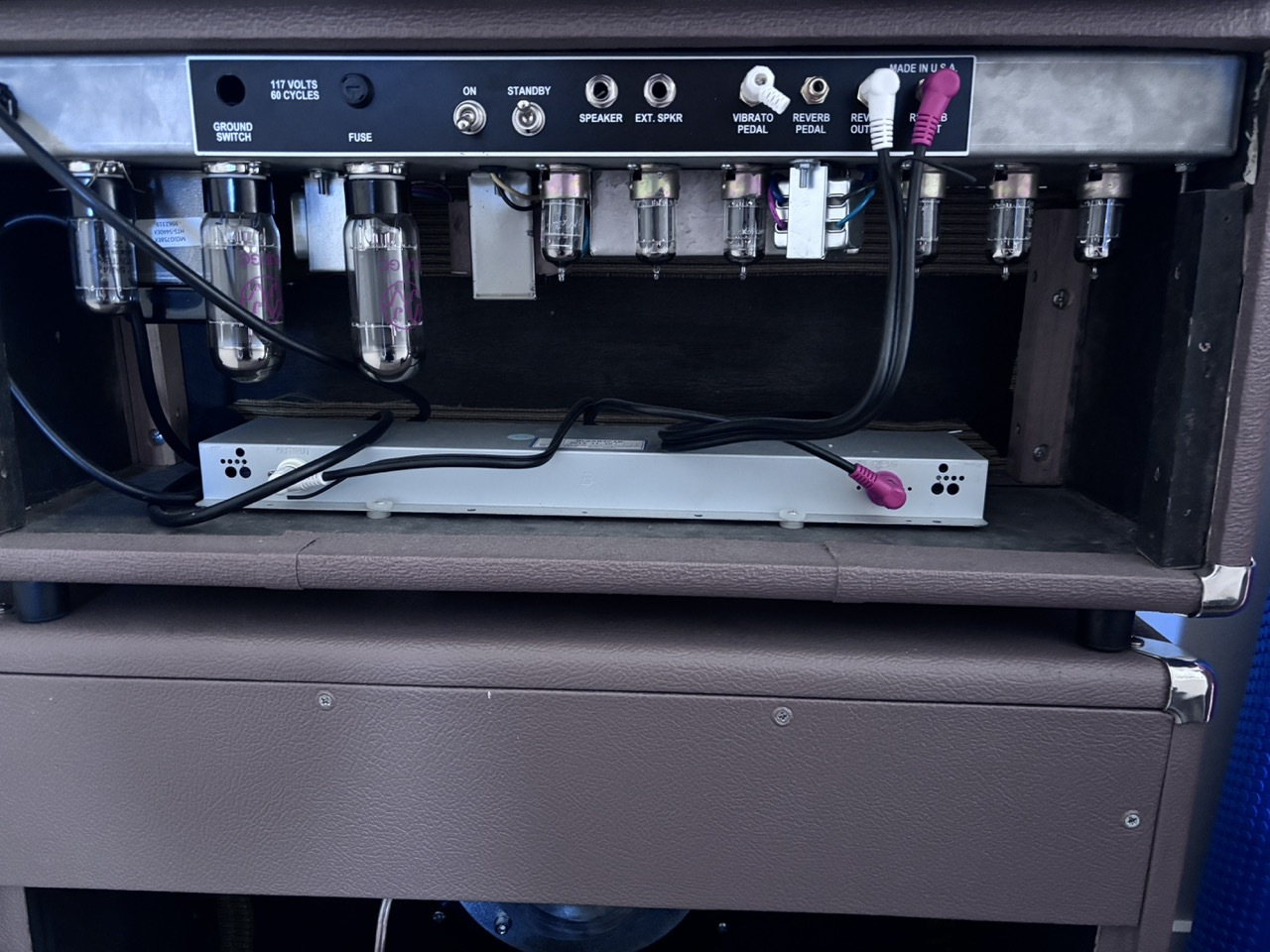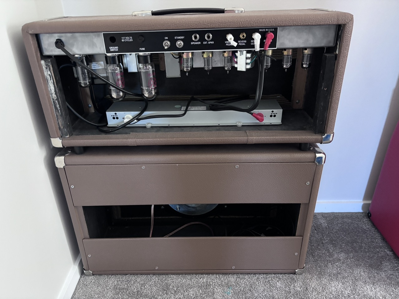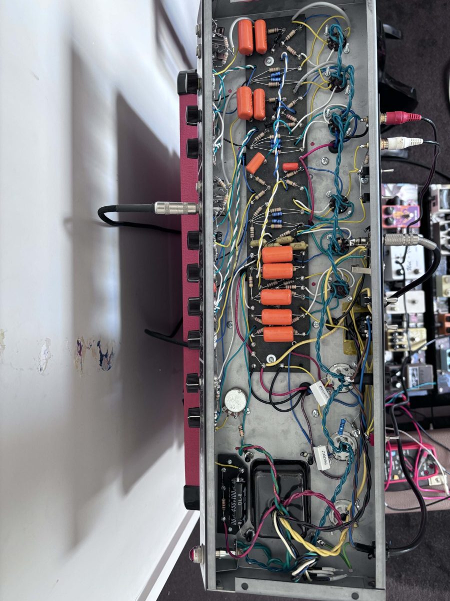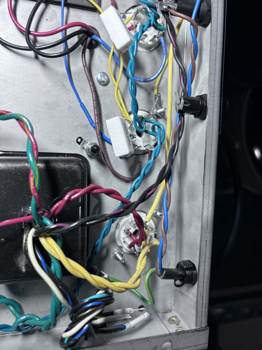 I had a fair few issues powering it up for the first time. I was using new old stock tubes and trying to get a matched set of power tubes was not easy. I did use a variac to bring the voltage up slowly so as to not damage the transformers which were the least replaceable part of the whole thing. I was chasing a hum for a while, which ended up being some wiring mistakes, bad jacks/switches and old caps which I swapped out in the end. Most of the passive parts aren’t ‘Period correct’ and neither is the wiring, but I used what I had around to finish the project out and get it working. I had to make a grounding jack for the vibrato as I wasn’t going to use it, and I was chasing a reverb not working issue for a while as well which was a wiring mistake + bad tubes.