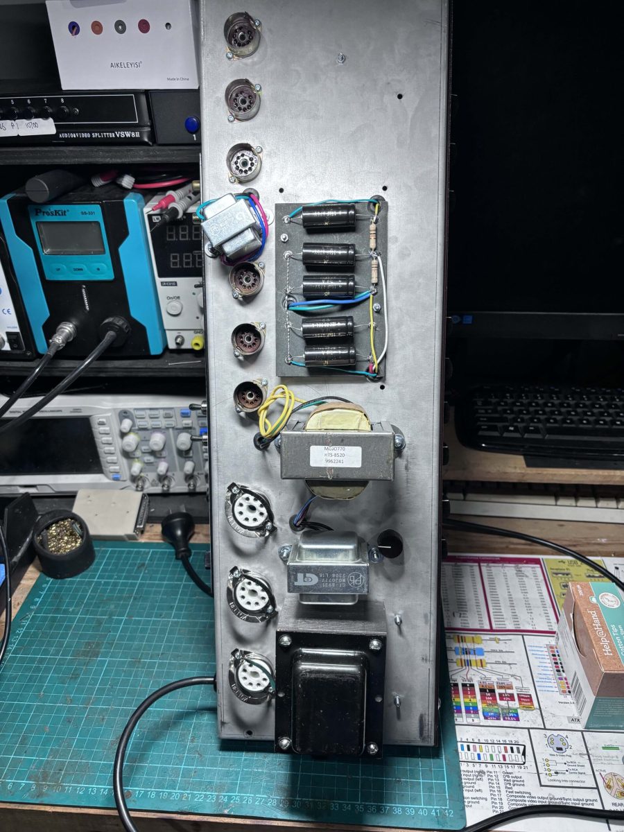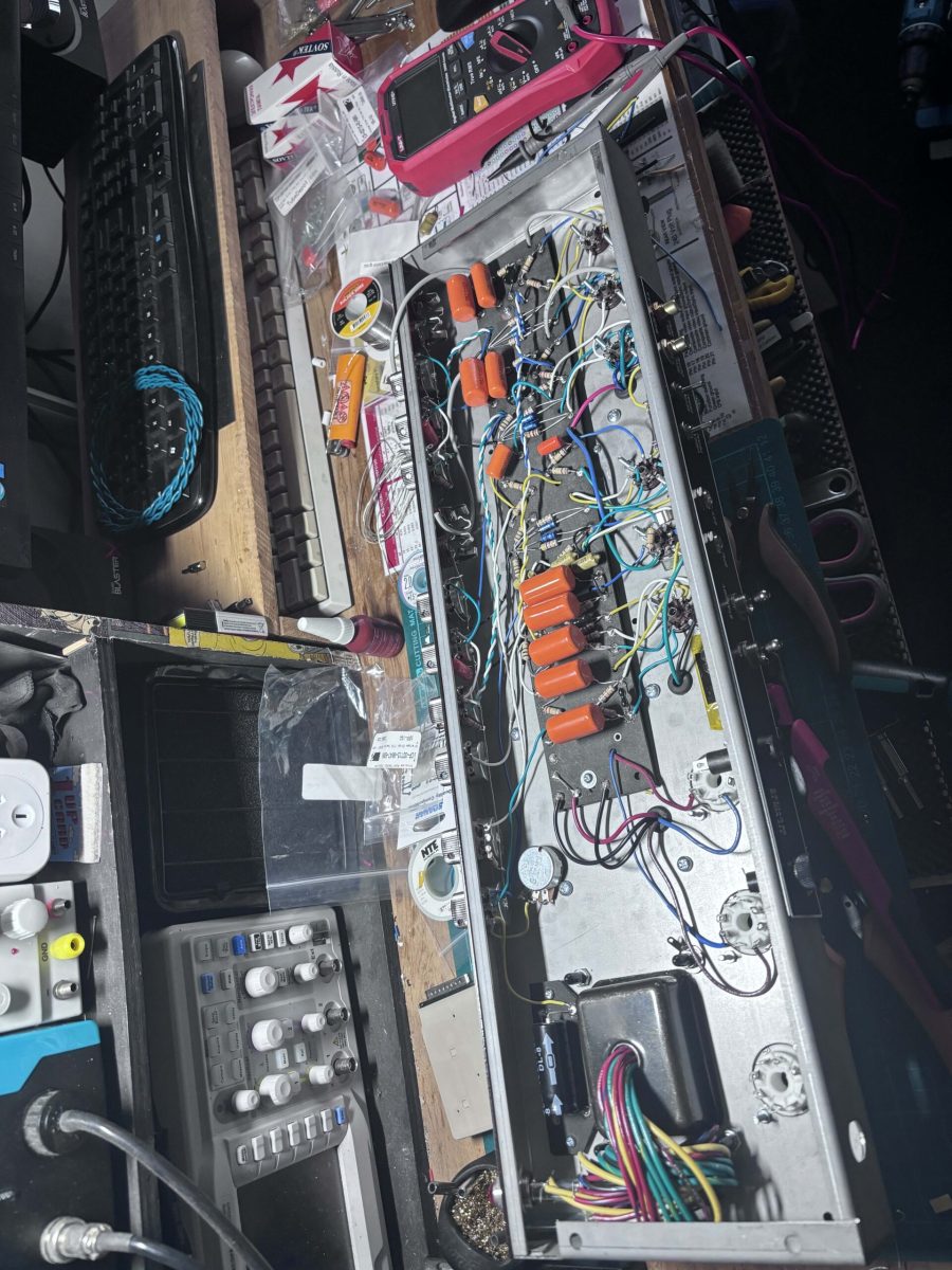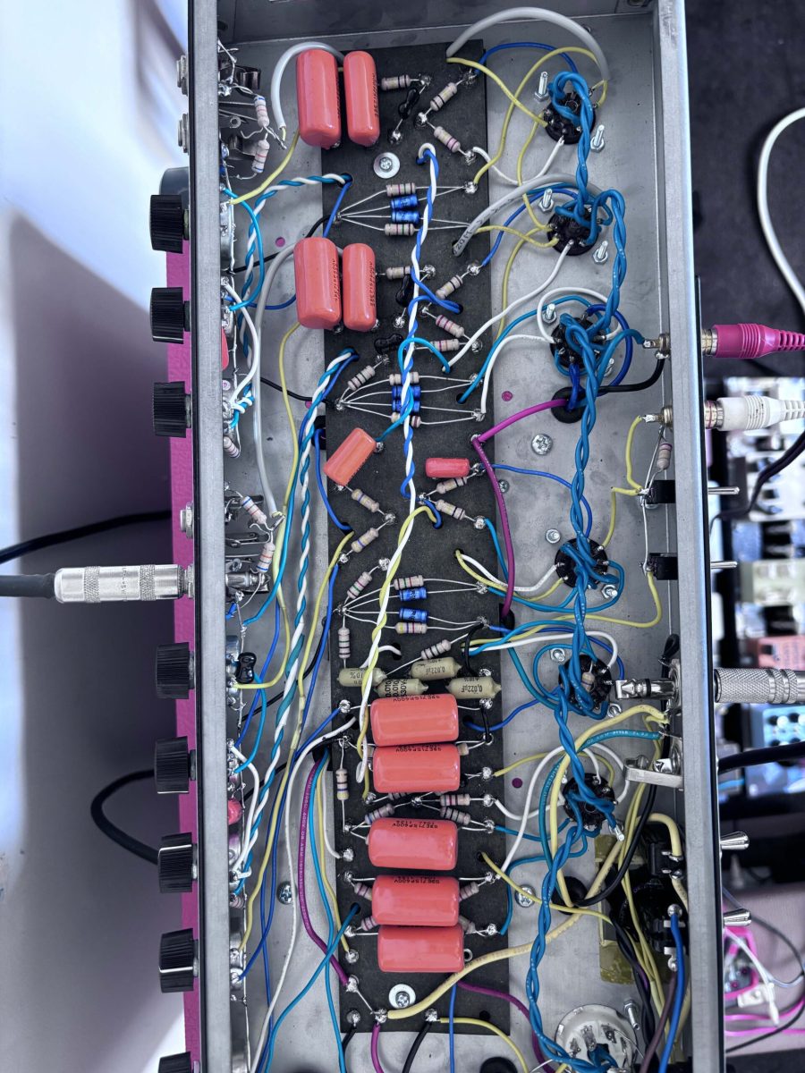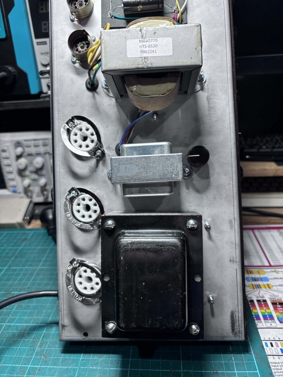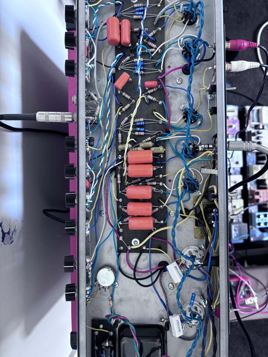 I had a fair few issues powering it up for the first time. I was using new old stock tubes and trying to get a matched set of power tubes was not easy. I did use a variac to bring the voltage up slowly so as to not damage the transformers which were the least replaceable part of the whole thing. I was chasing a hum for a while, which ended up being some wiring mistakes, bad jacks/switches and old caps which I swapped out in the end. Most of the passive parts aren’t ‘Period correct’ and neither is the wiring, but I used what I had around to finish the project out and get it working. I had to make a grounding jack for the vibrato as I wasn’t going to use it, and I was chasing a reverb not working issue for a while as well which was a wiring mistake + bad tubes.