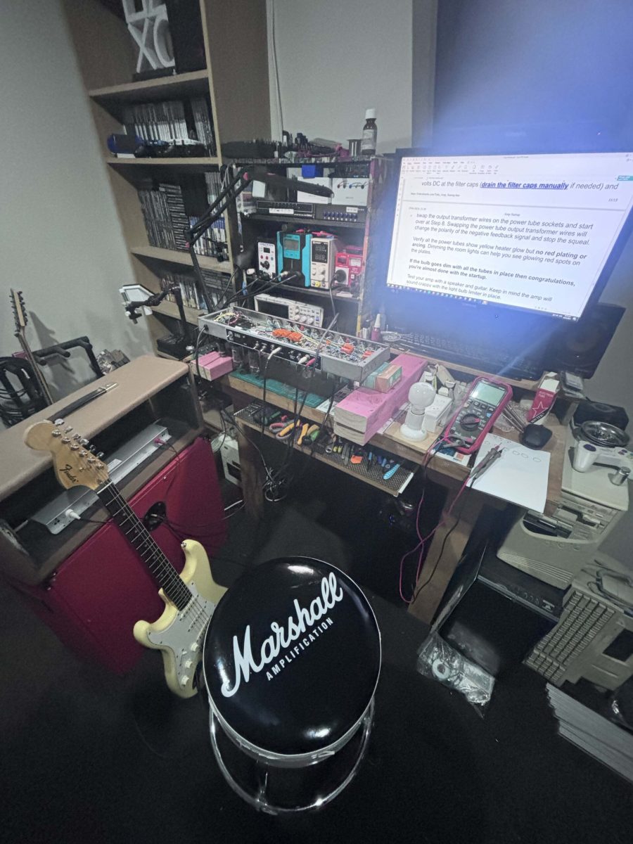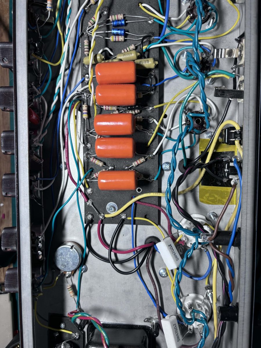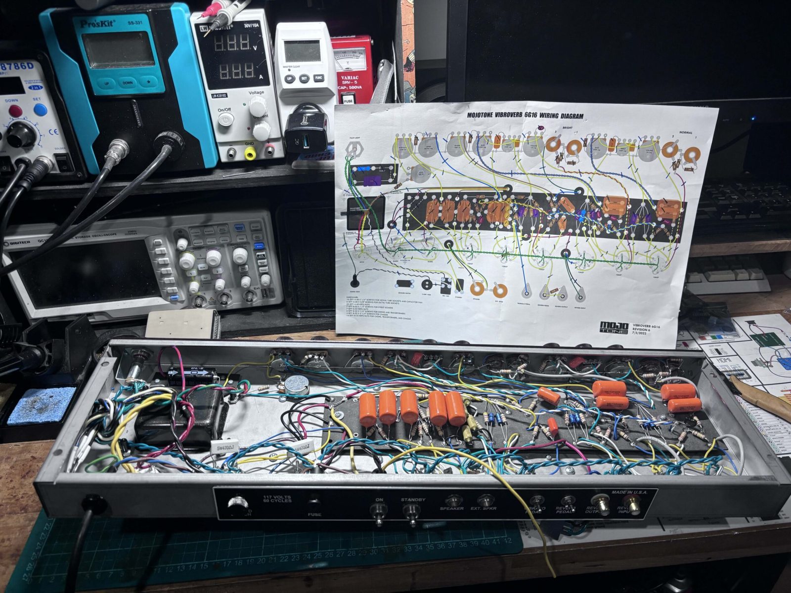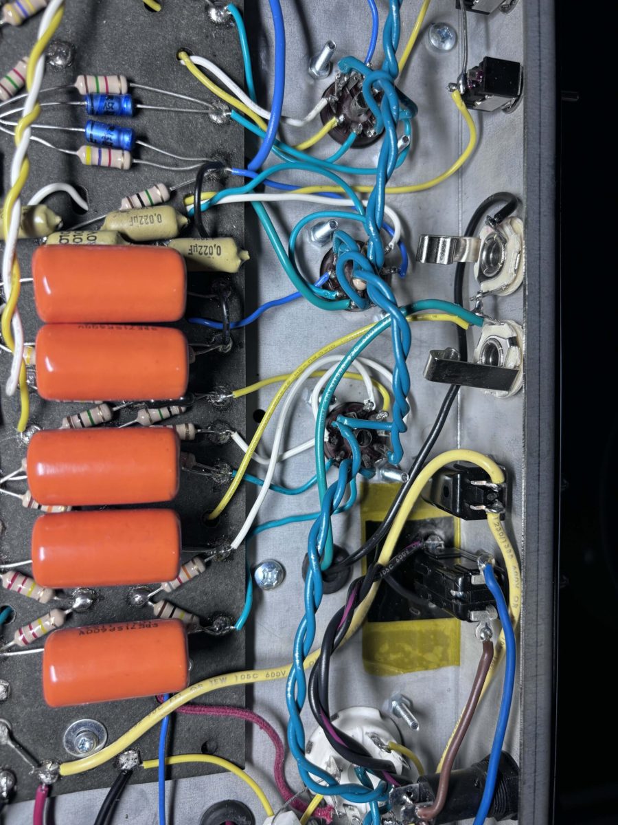 Most of the parts came from Tube Depot or Mojotone, for me I had to make sure I ordered the correct international voltage transformers and I managed to buy them when the exchange rate wasn’t entirely awful. Most of the caps are new except I opted to use some old mustard caps I had in the stash where I could. I followed the main wiring diagram with not much changes except I added in some extra fuses, omitting the ground switch and wired the speaker outputs slightly different. I originally used toggle switches for the Vibrato and reverb pedal switches but later changed them to the correct RCA jacks due to induced noise.
