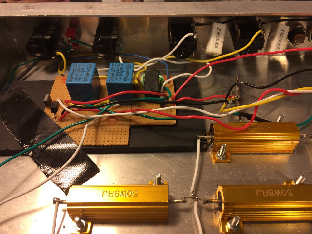 I had downloaded the schematics from Aiken Amps a long time ago as the site was often going down, now it’s gone forever by the looks! The general idea of the project was to have the unit switch the guitar signal as well as the main load of the heads between the cab and a 200W dummy load. Heres the schematic if you need it.