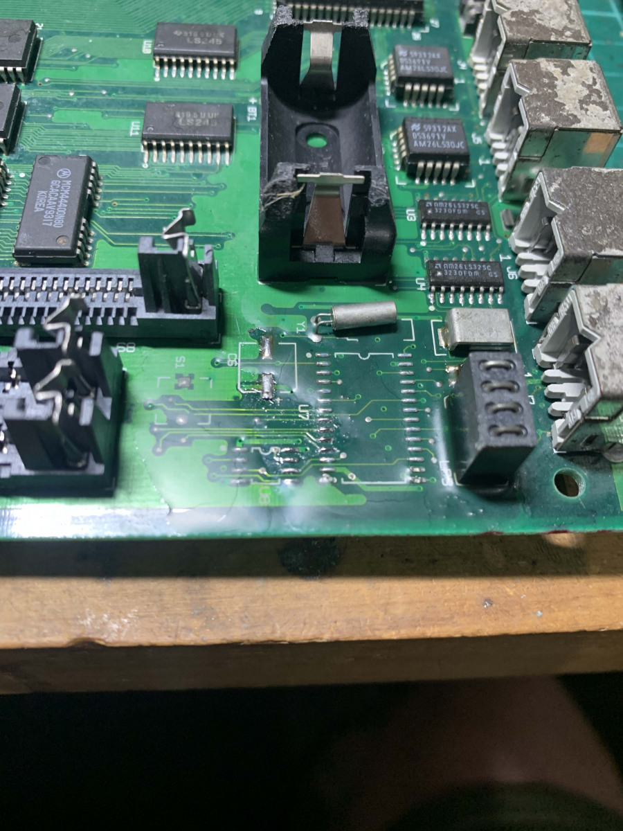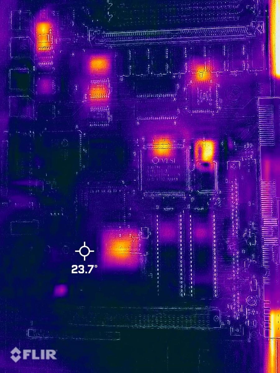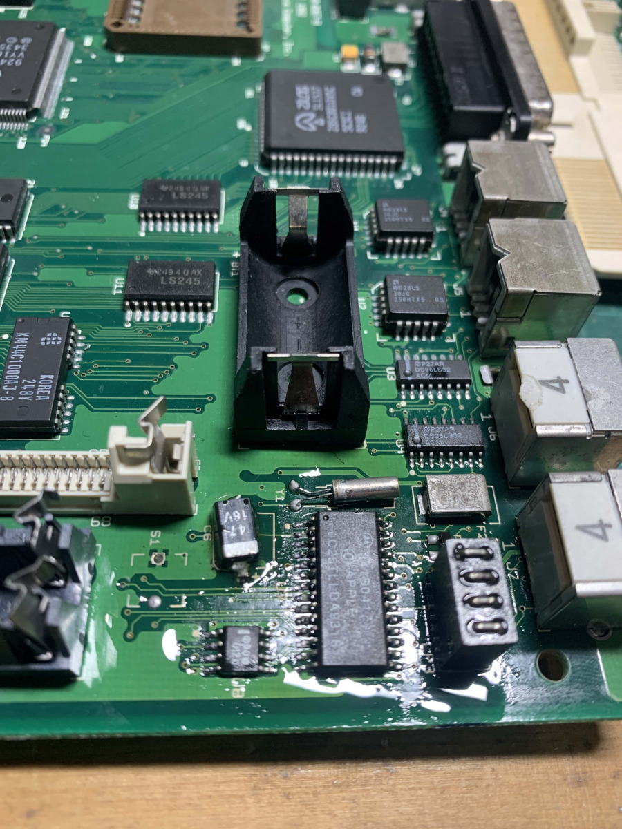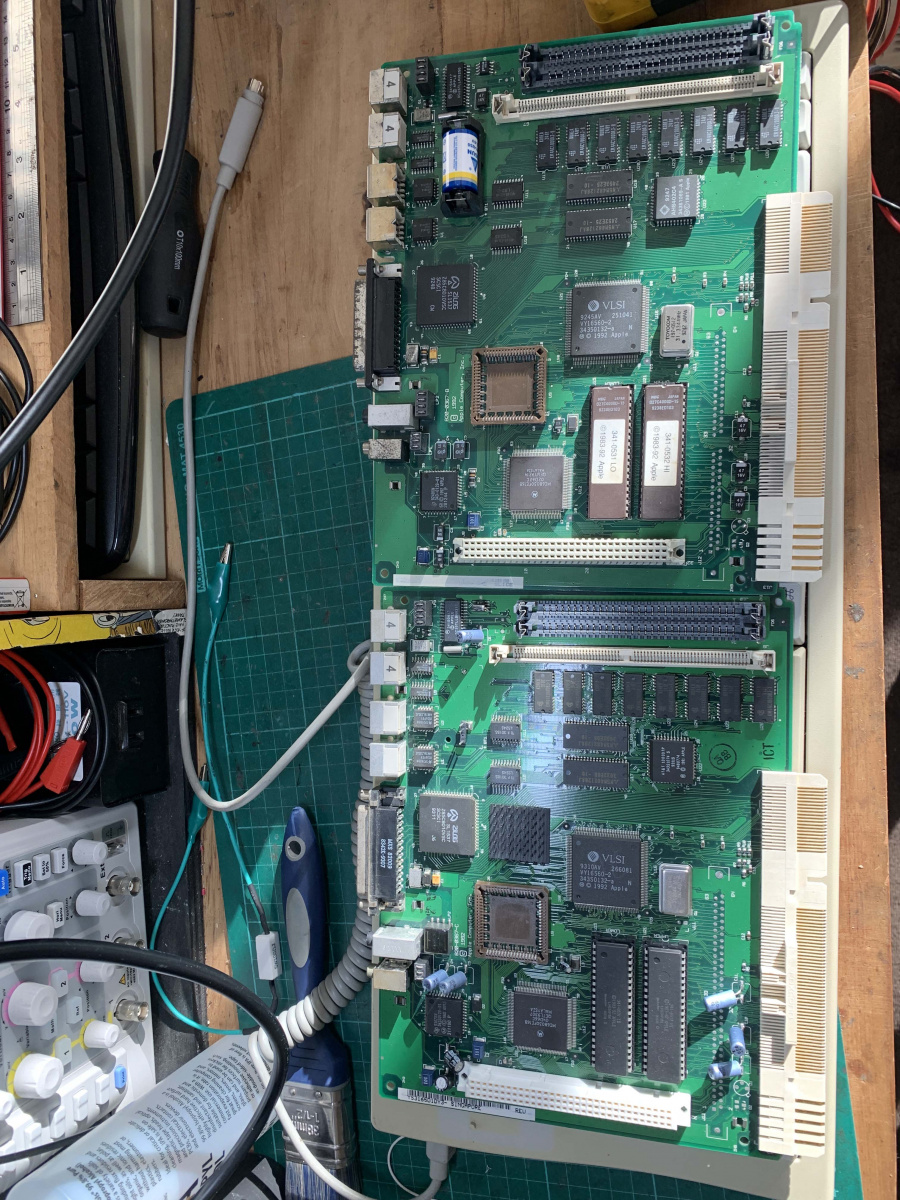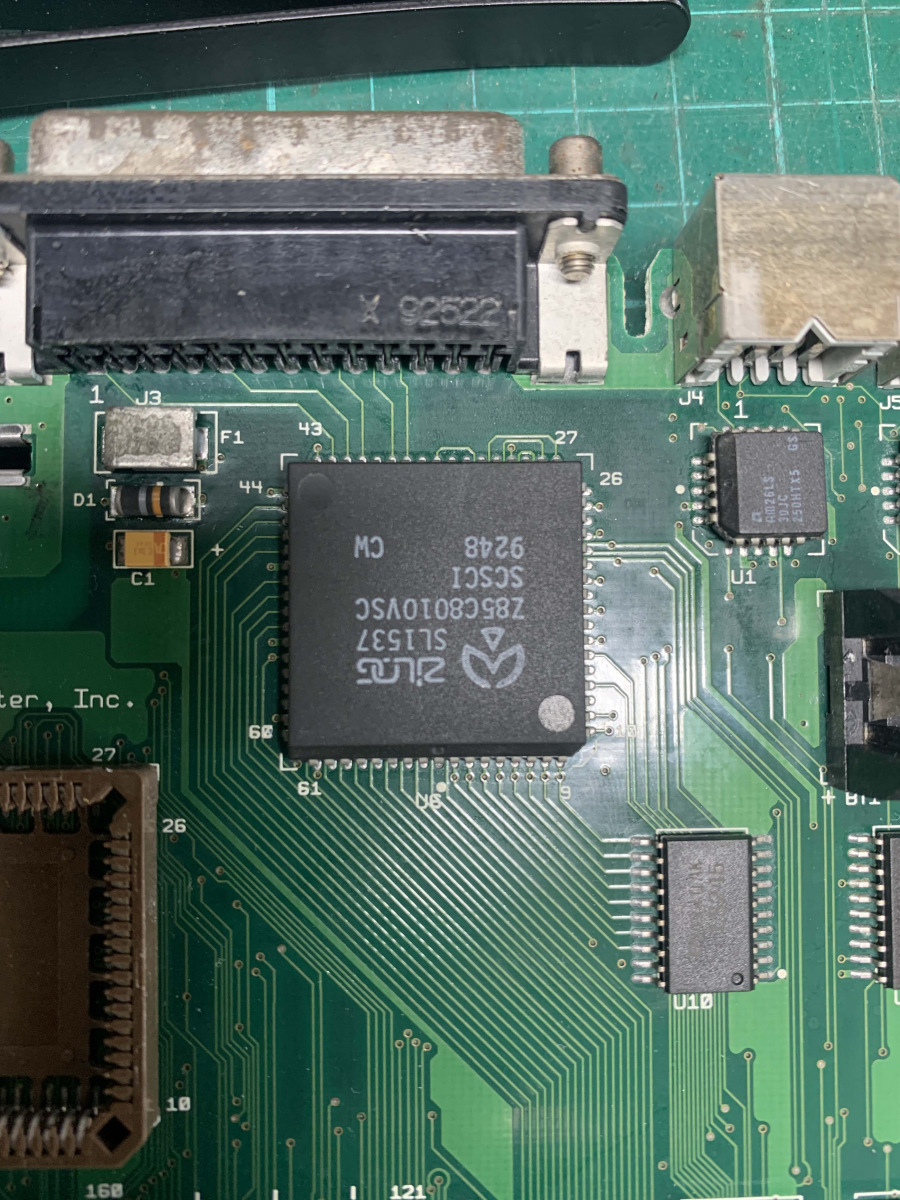 This part took a long time to do, referencing two different boards, fixing ripped traces, reflowing the new caps and even using my Flir Thermal camera to see what was getting hot, if anything. I cleaned the board multiple times and reflowed a bunch of parts and tested a huge amount of parts. Everything was pointing to power and U7/U8. The ADB power key should pull two pins low, which wasn’t right as the pins were always low on this board so something was shorting it to ground. I replaced caps, resistors removed ADB ports and everything else. In the end I decided it had to be one of those 2 proprietary chips. So, I had to sit on it and wait for a parts to turn up or a modern way to replace those parts.