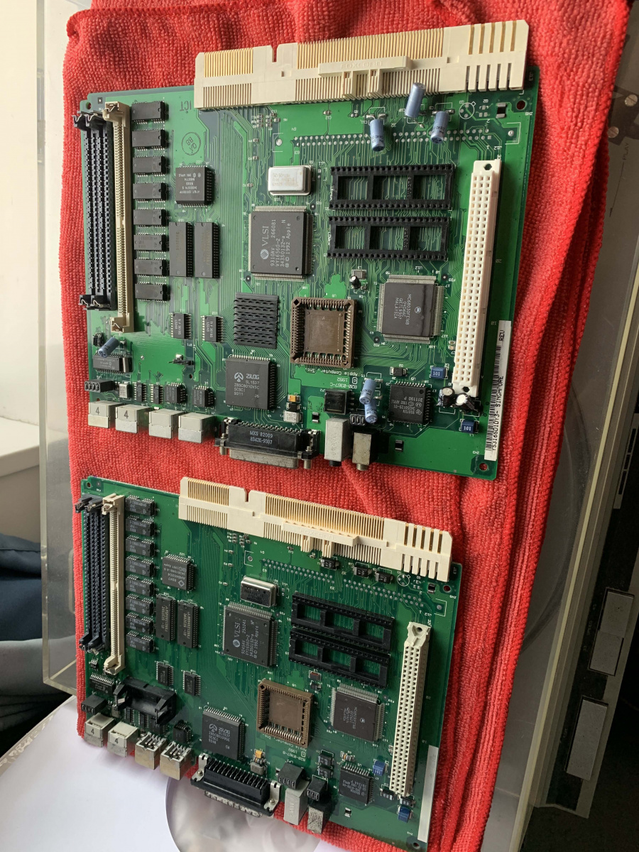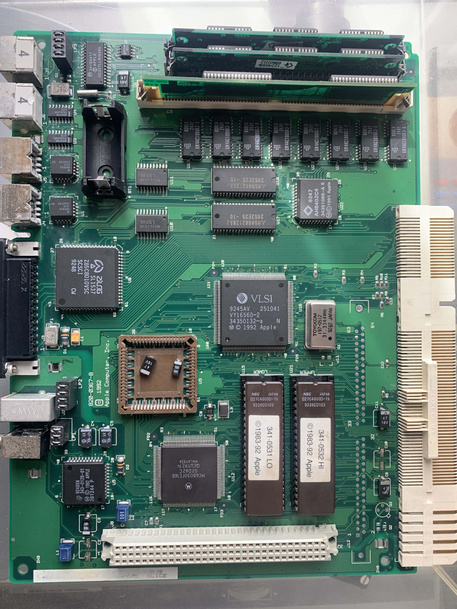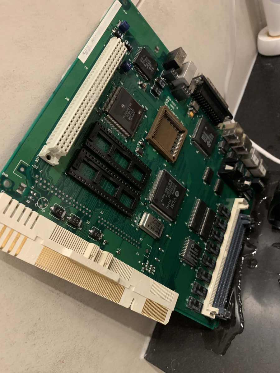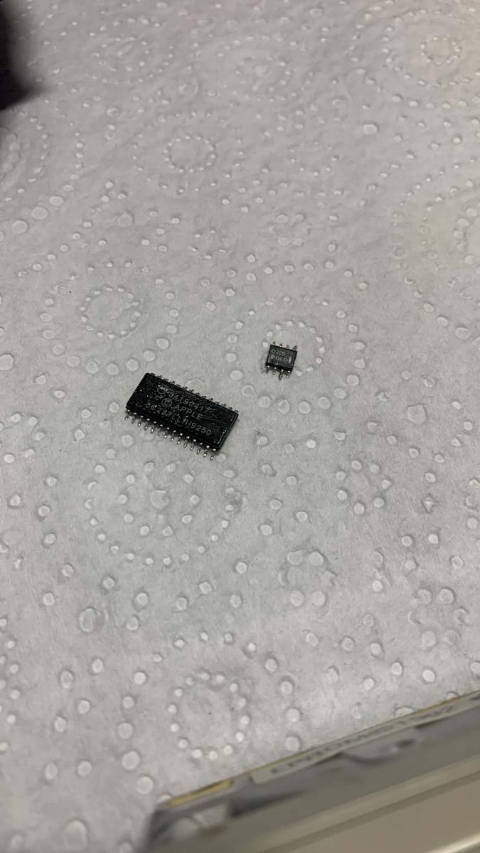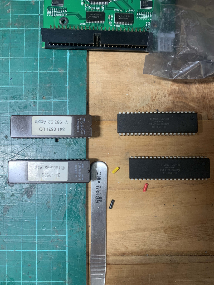 This part took a long time to do, referencing two different boards, fixing ripped traces, reflowing the new caps and even using my Flir Thermal camera to see what was getting hot, if anything. I cleaned the board multiple times and reflowed a bunch of parts and tested a huge amount of parts. Everything was pointing to power and U7/U8. The ADB power key should pull two pins low, which wasn’t right as the pins were always low on this board so something was shorting it to ground. I replaced caps, resistors removed ADB ports and everything else. In the end I decided it had to be one of those 2 proprietary chips. So, I had to sit on it and wait for a parts to turn up or a modern way to replace those parts.