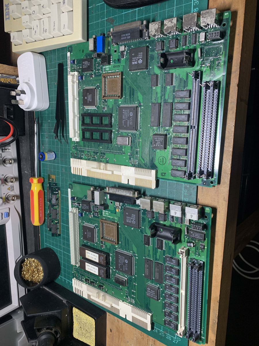 Luckily for me, the same person I got the machine off also found another mainboard, which had ripped traces, missings caps and missing chips. BUT it had U7 and U8 still in tact. Stupidly I should have done one chip at a time but I did both and the machine fired into life! The short on the ADB port was gone, so all I know is that it was either U7 or U8, I am fairly certain it was U7 though.