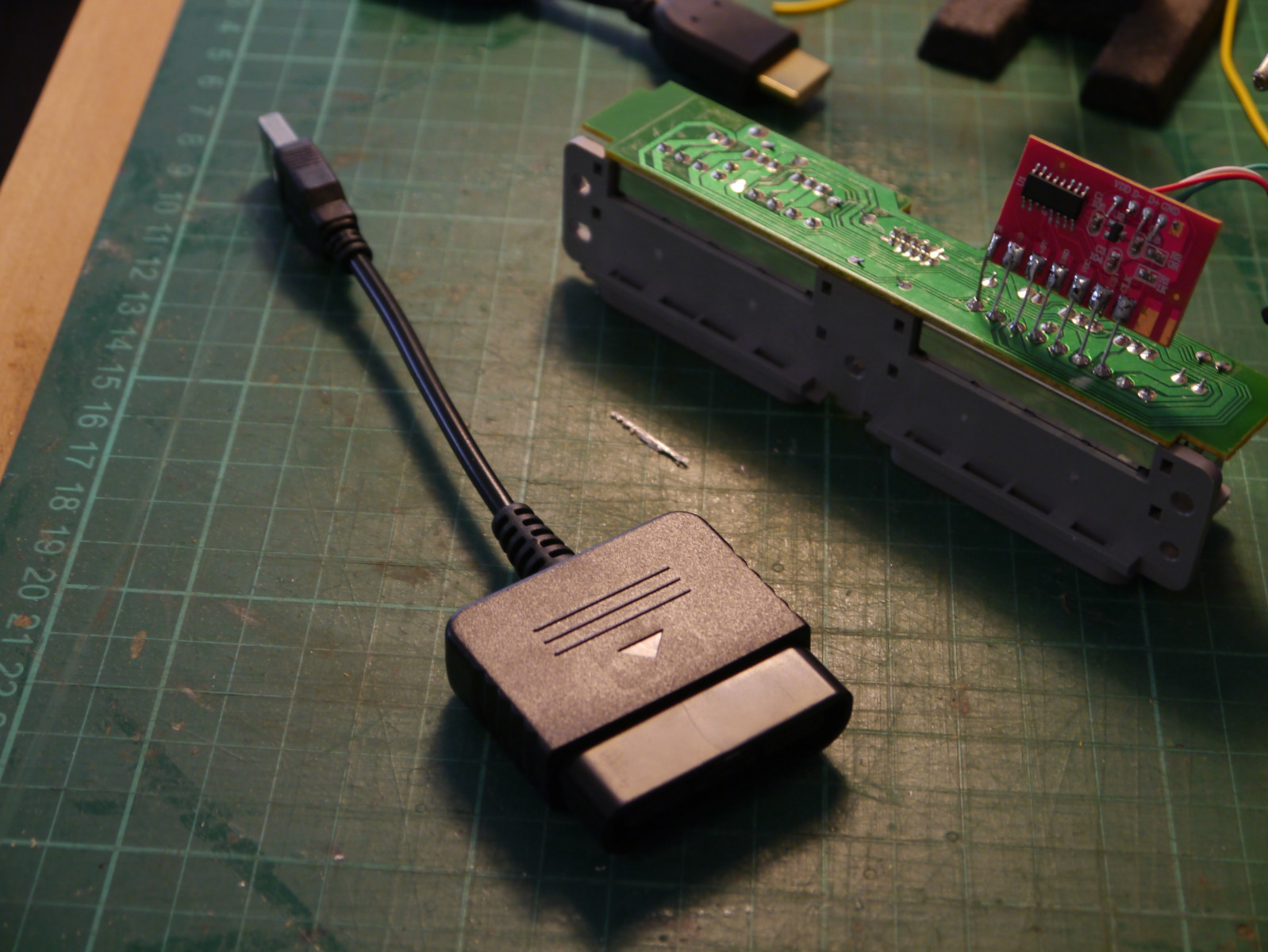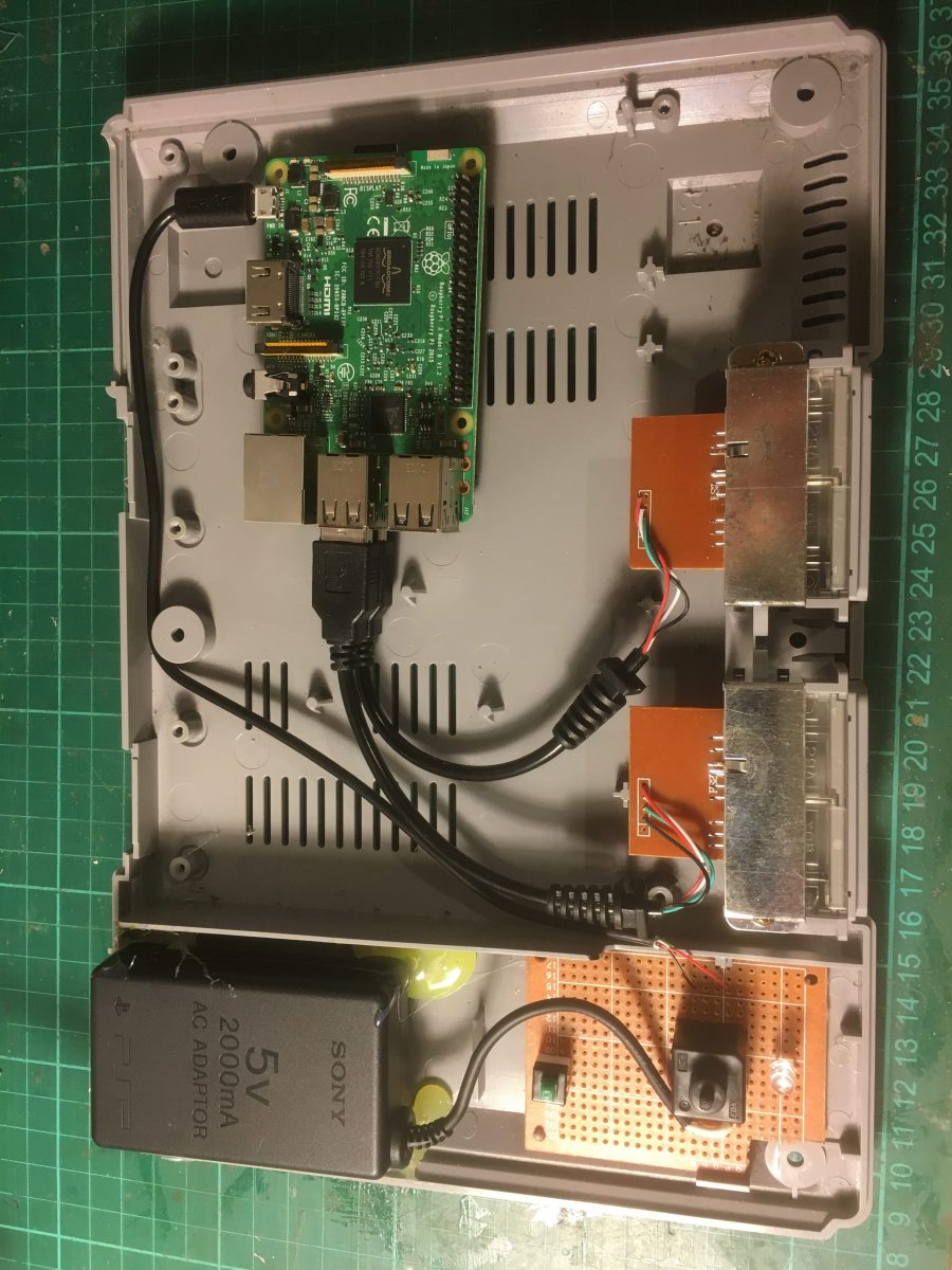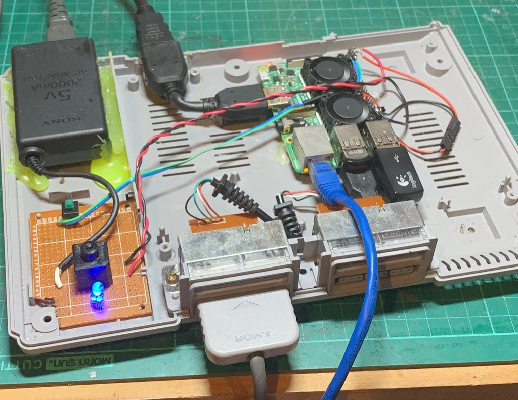 After the controllers were working, it was pretty straight forward to get the rest done. I just had to strip the PS1 case down, remove all the standoffs, dremel out the eject area to get the lid to close and then use some of the cut off standoffs to glue back in and mount the Raspberry Pi. The Power supply is actually a PSP power supply mounted in the same spot as the stock one with ALOT of hot glue, the figure 8 power port even lines up with the stock hole in the back! It’s like I was suppose to do this. To get the PS1 power, reset and LED to work, I stripped these off the stock power board and made up a small stripboard to mount it all. In it’s current configuration, the Power button gives the unit power, and turns the LED on and the Reset switch runs a soft shut down script from RetroFlag.The HDMI cable is just a small flexible extender I found in a box at work that I then glued into the case where the standard port would be.