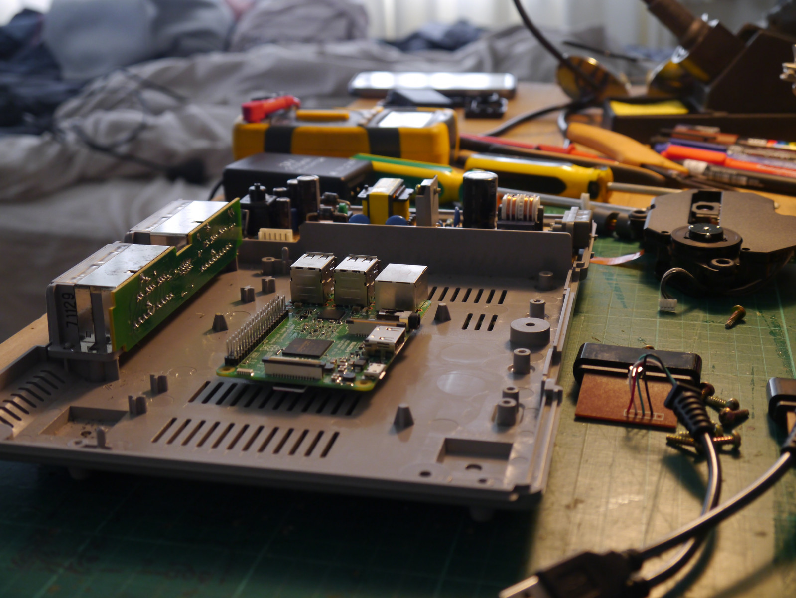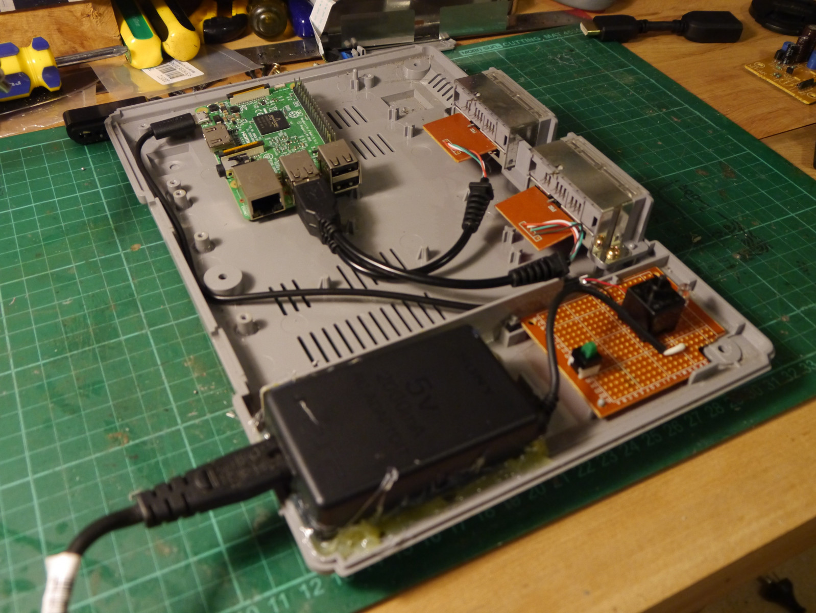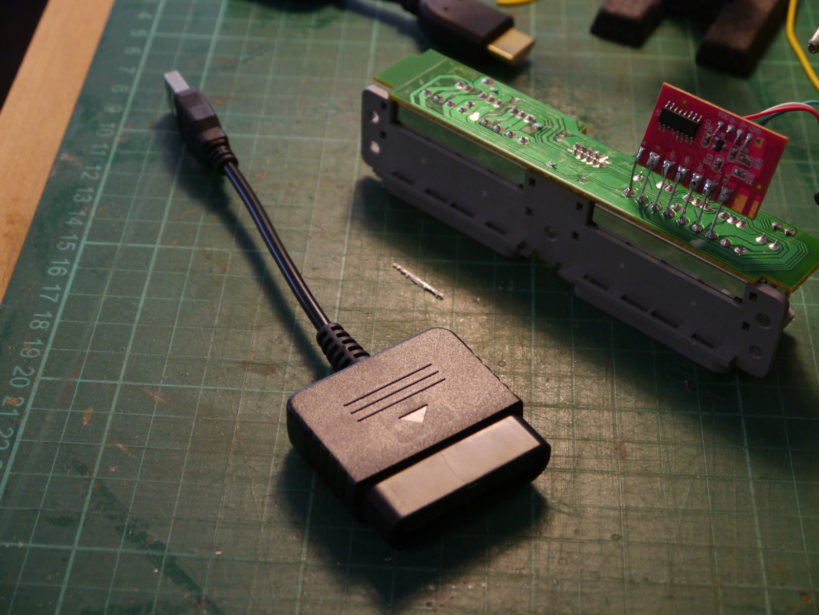 After the controllers were working, it was pretty straight forward to get the rest done. I just had to strip the PS1 case down, remove all the standoffs, dremel out the eject area to get the lid to close and then use some of the cut off standoffs to glue back in and mount the Raspberry Pi. The Power supply is actually a PSP power supply mounted in the same spot as the stock one with ALOT of hot glue, the figure 8 power port even lines up with the stock hole in the back! It’s like I was suppose to do this. To get the PS1 power, reset and LED to work, I stripped these off the stock power board and made up a small stripboard to mount it all. In it’s current configuration, the Power button gives the unit power, and turns the LED on and the Reset switch runs a soft shut down script from RetroFlag.The HDMI cable is just a small flexible extender I found in a box at work that I then glued into the case where the standard port would be.