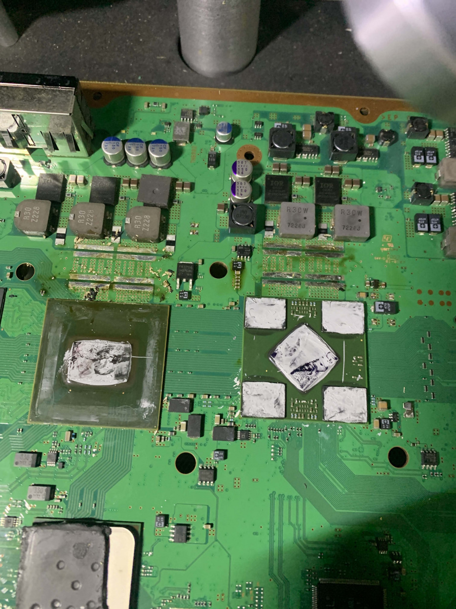 This was not the first time this PS3 has been stripped down to the motherboard. You can see that the CPU and RSX have been delidded and the thermal paste/compound has been replaced. This lasted a little while until it kicked another YLOD about 6 months later. My next point of call was to replace the notorious NEC Tokin caps. All of this was done before this video came out detailing a much better diagnosis process using the SYS_CON reading method.