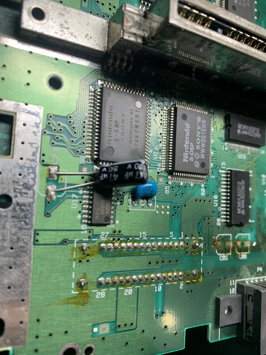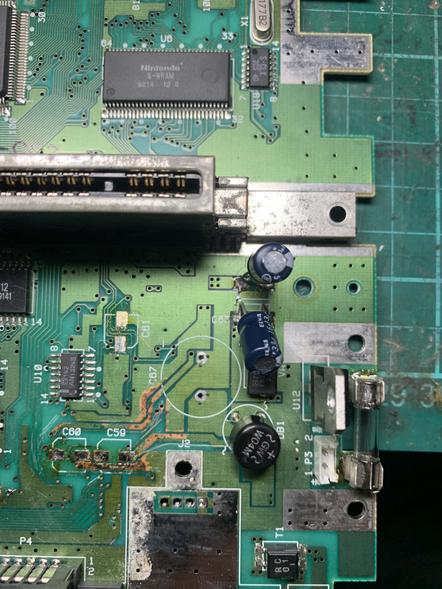 This is round 2 for the SNES. It has had a re-cap in the past but some of the leaky cap juice was missed and continued to corrode away traces. This was found out while trying to get a SNES scart cable working.