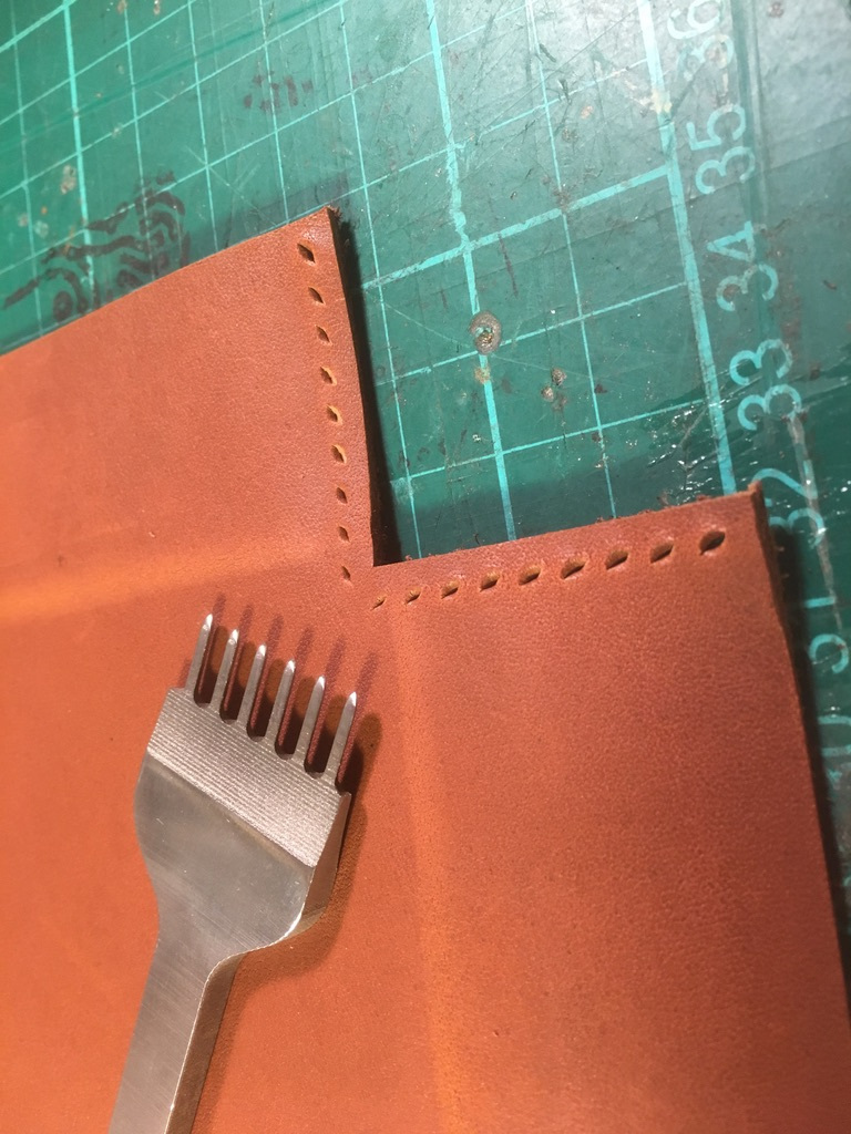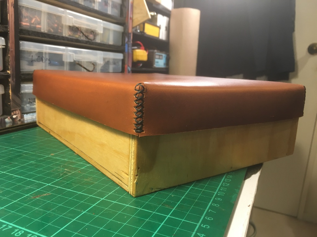 Annoyingly, I forgot to take photos of putting thee wooden box together ( i’m trying to get better with progress photos ) So I only have a few photos of getting the lid pattern figured out using some masking paper to get the size out. I figured if I make the paper fit snug, once the thickness of the leather is taken into account it will be a tight slip on fit, ideally i’ll add some snap on buttons to keep the lid on it. I ended googling/youtubing how to make a saddle stitch and it turned out really well, the first time I tried this technique.